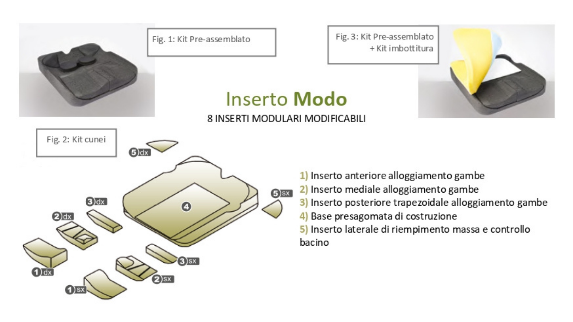 Il cuscino "Inserto Modo" è progettato per chi conduce una vita attiva e non vuole rinunciare al comfort e alla stabilità. È leggero, soffice e posturale. La struttura fissa lateralmente e posteriormente è completamente adattabile anteriormente e internamente, garantendo un adeguato adattamento alla massa corporea e consentendo la gestione di asimmetrie, obliquità pelviche, retroversioni e antiversioni. Questo cuscino include un kit strutturale, un kit di imbottitura "Forme Libere" e una fodera di rivestimento New3D.