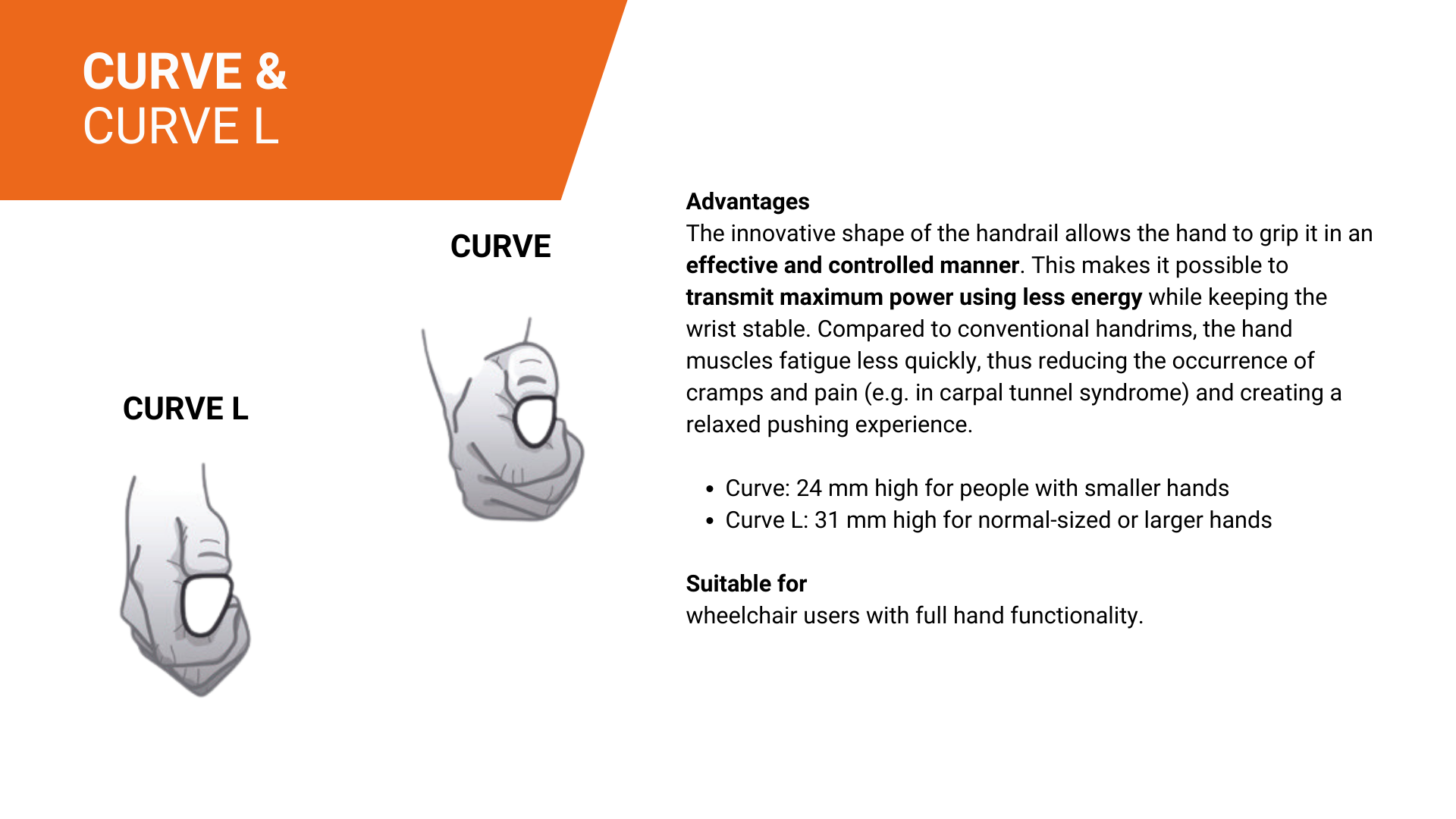 The initial impulse to work for the mobility of wheelchair users arose from conversations with a wheelchair-riding friend of the founders. These occasions opened their eyes to the potential of developing handrims to improve the mobility of wheelchair users. In this context, the first handrim, the CURVE, was developed. It owes its perfect ergonomic fit to the imprints by using modelling clay and which ideally represents the natural anatomy of the hand.