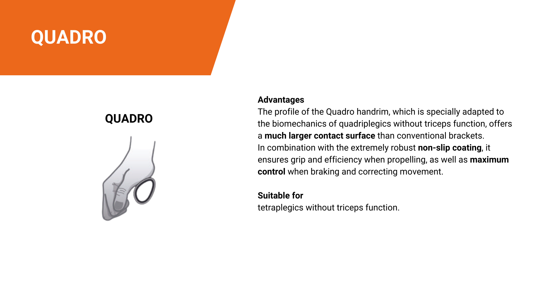 With the aim of offering every wheelchair user the handrims tailored to their individual needs, we have developed a range of innovative handrims in close cooperation with wheelchair users, physiotherapists and specialist retailers. Each handrim has been tested by experienced users with different pathologies to ensure the best feedback for maximum product improvement.